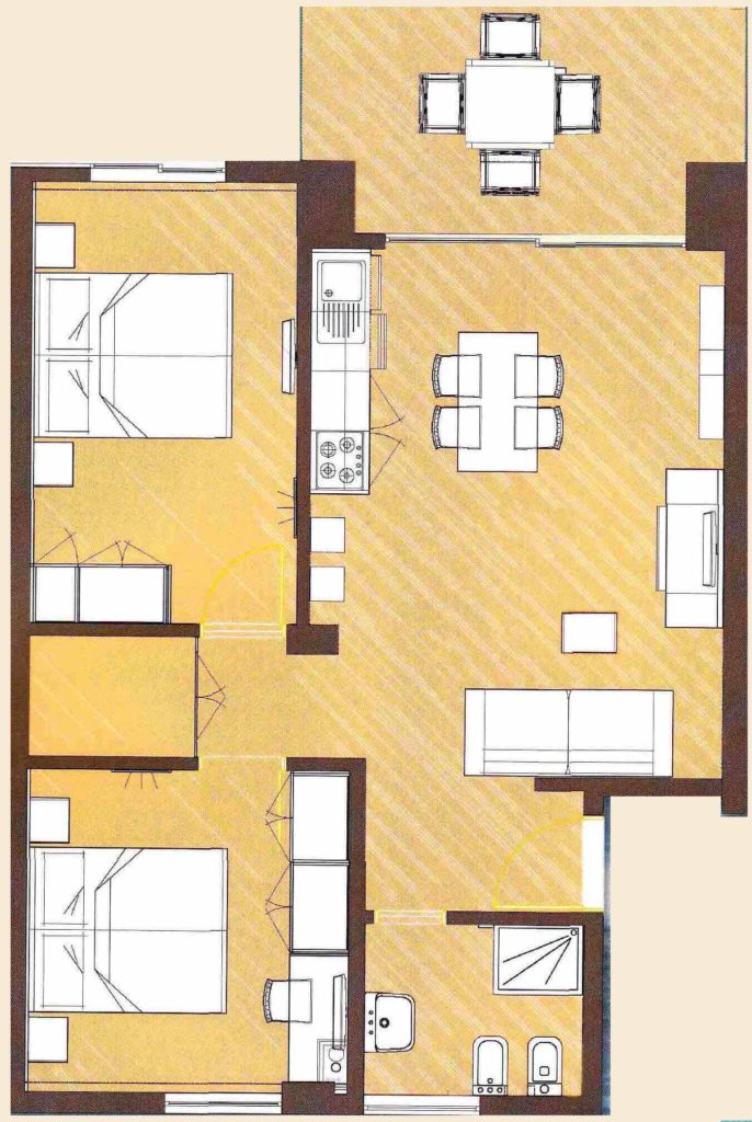 The Areia type features two double bedrooms and a bathroom with a shower. A large living room with a kitchen and a terrace complete the apartment, comfortably accommodating up to six guests.